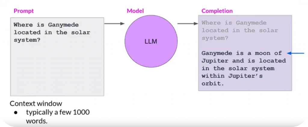 Completion: After processing the input (prompt and context), the model generates a response. This response is called a completion. It’s the answer, suggestion, or continuation of text provided by the LLM based on the input it received.