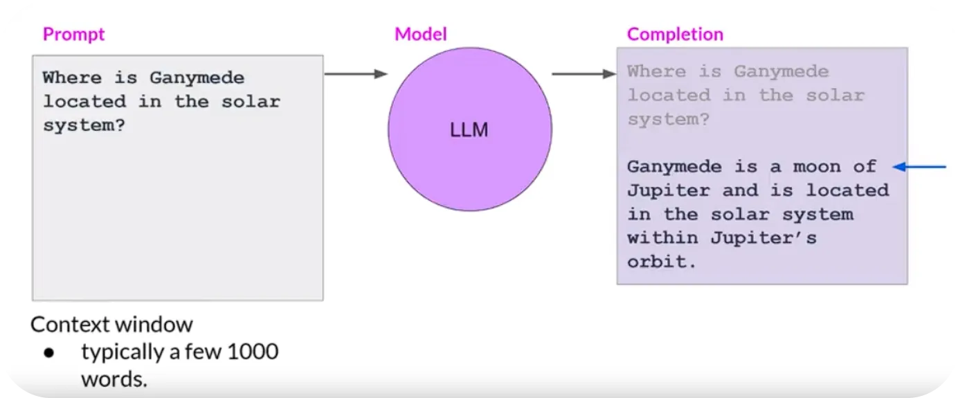 Inference: This is the process of asking a question or inputting a prompt into the model and receiving a completion as a response. So, when we interact with the LLM by asking it questions or giving it prompts, we are essentially engaging in inference.